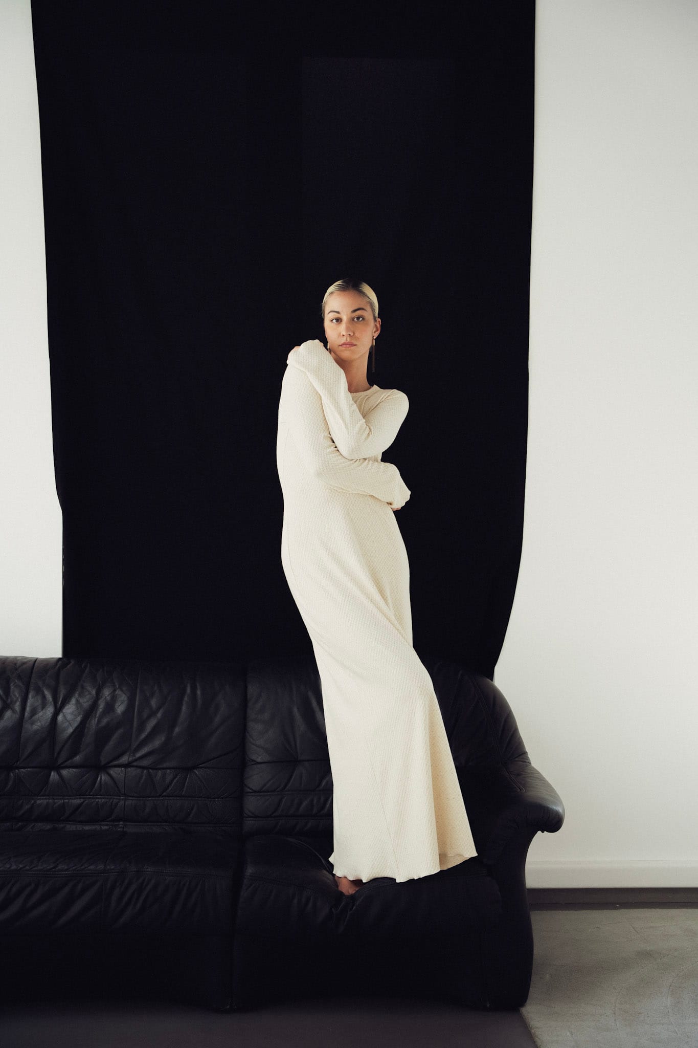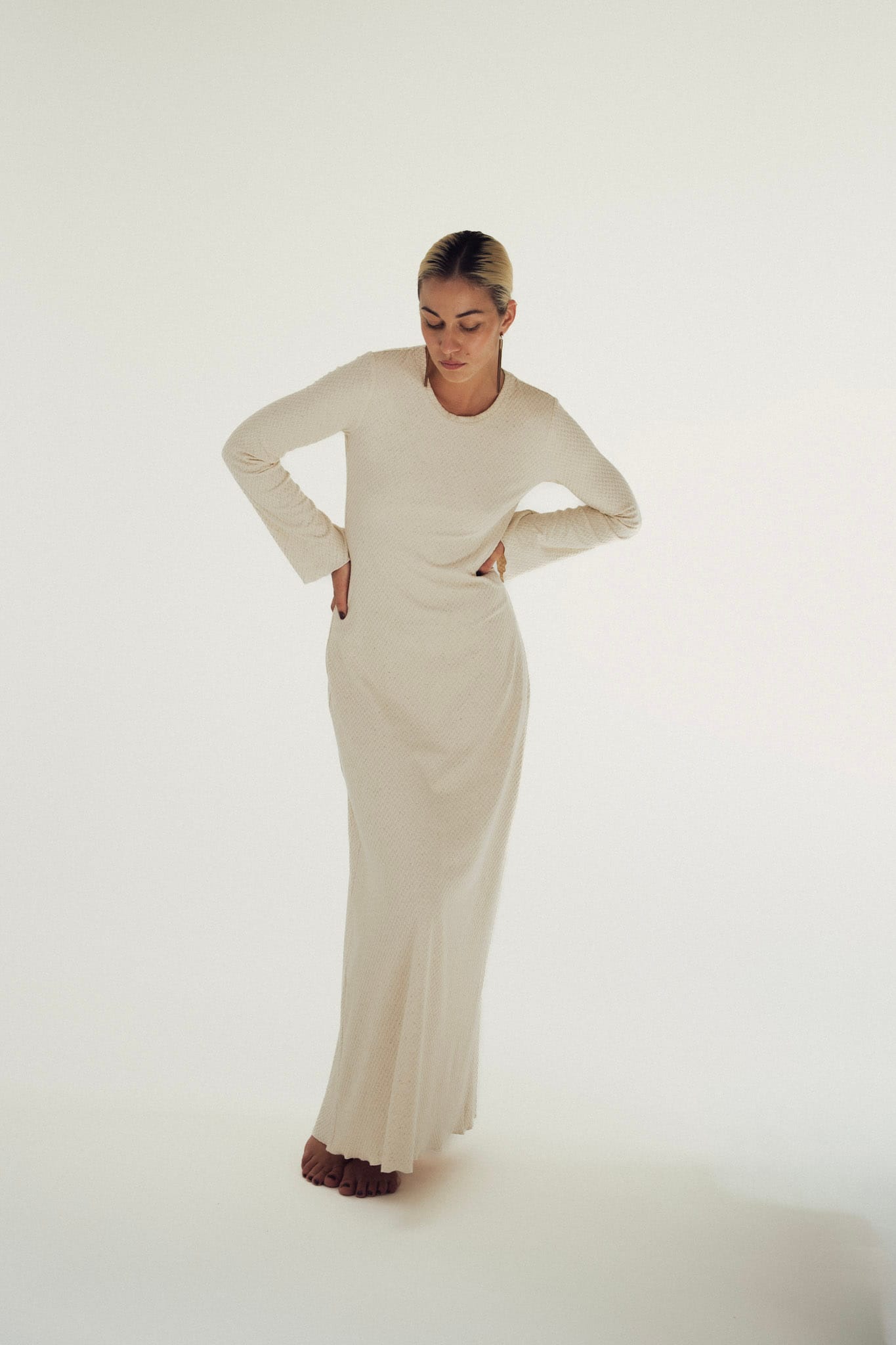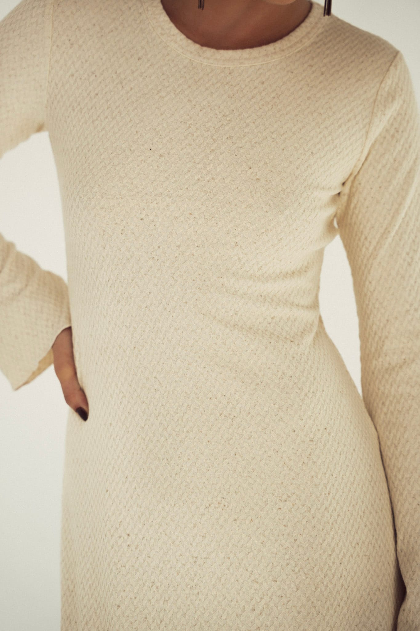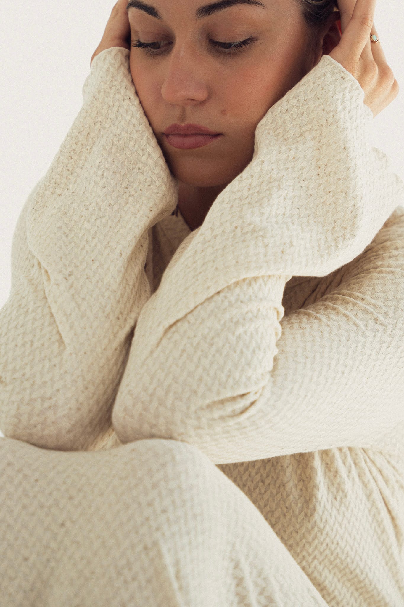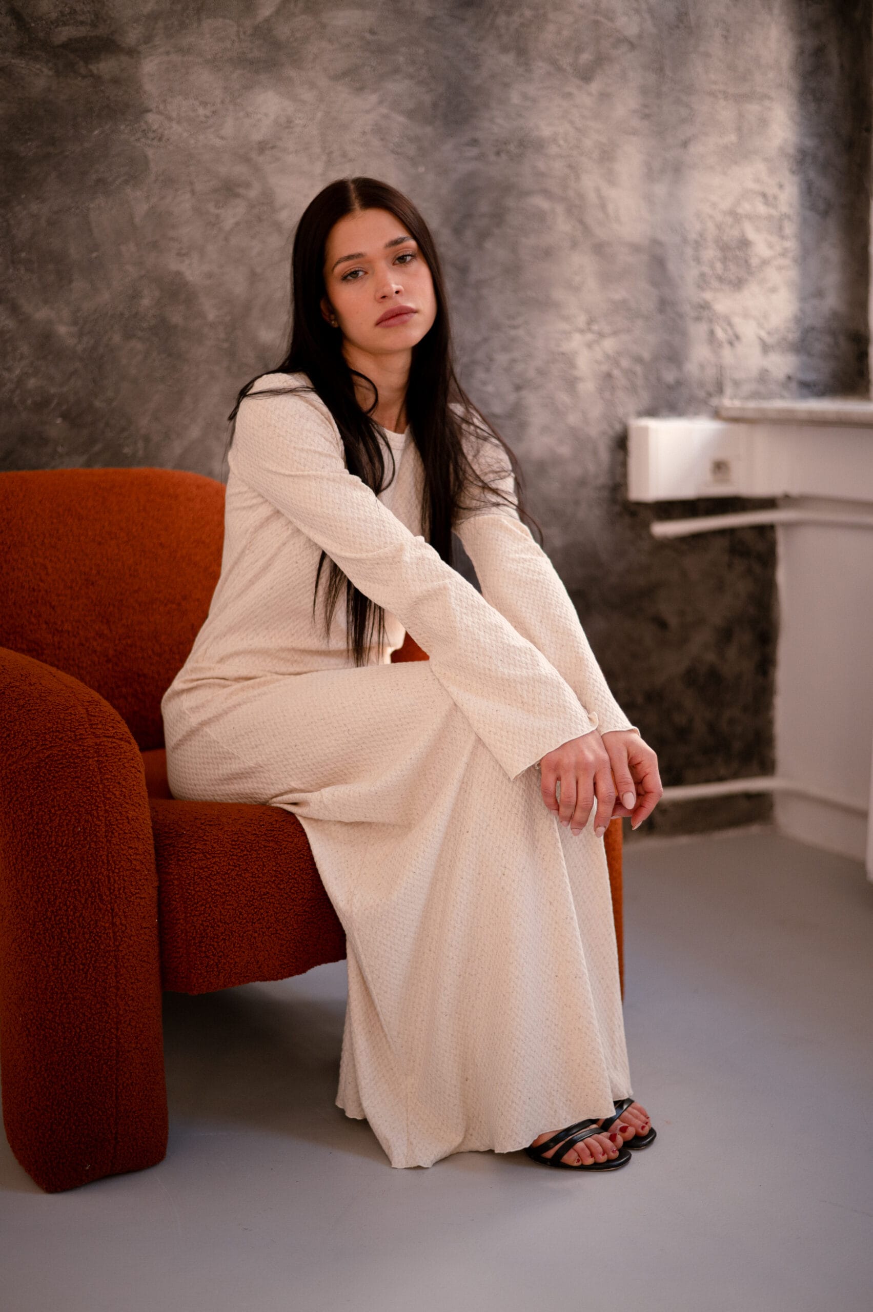 Wykonana z elastycznej dzianiny o delikatnej fakturze, zapewnia komfort zarówno w domowym zaciszu, jak i podczas spaceru czy kameralnych spotkań. Kremowy odcień podkreśla naturalne piękno i wpisuje się w ponadczasową estetykę marki Moonwear.