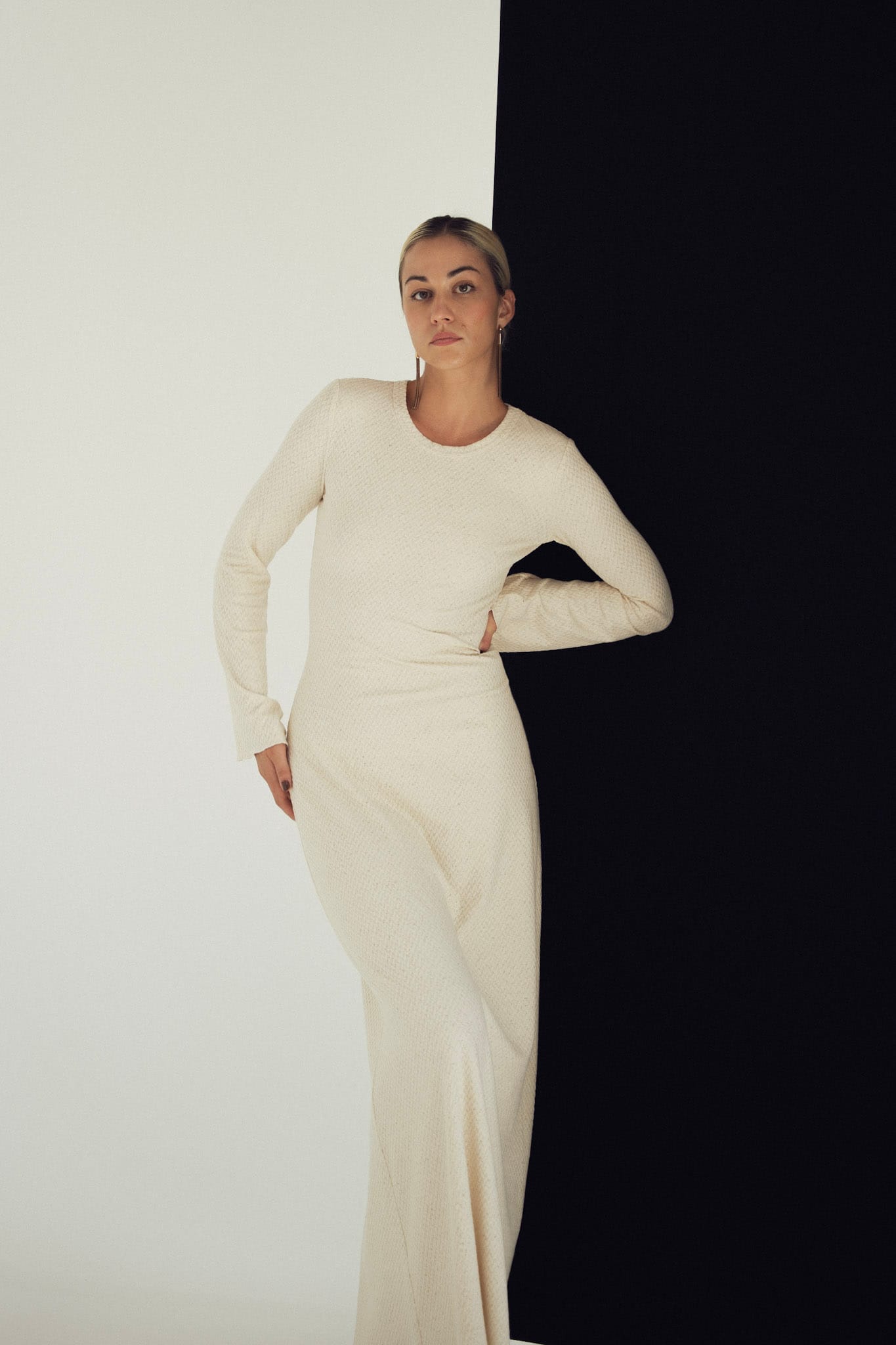 Stworzona z myślą o kobiecości i wygodzie, sukienka Luna Calma to minimalistyczna propozycja, która otula ciało niczym miękka mgiełka. Jej prosty, lekko rozszerzający się ku dołowi fason oraz długi rękaw nadają sylwetce subtelności i harmonii.